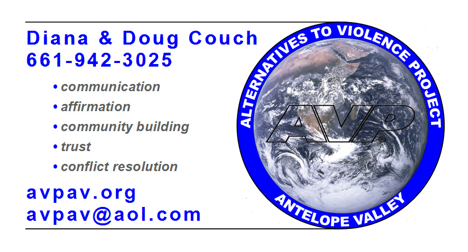 A few examples are given below for creating business cards, brochures, multi-page information packets (8.5"x11"), in "as-is you-edit" versions, and are available free for downloading. These can also be made available in modified versions with your choices of name, color, web or email address, addition of phone and address as desired. Send more to make such items easily available.For AVP Groups who have such materials to offer: Please feel free to contact Doug with suggestions for making these more available. Whether these items are offered free or for donations or cost reimbursement and workshop activity support, they are welcome here. Your group can have these items listed on this web site...or if preferred, you can place them on your own web site and have them linked to from here. Alternatively, if neither of these options are exactly what you would like, a link to an email address of someone in your group can be linked here, allowing people to contact you to arrange for obtaining these items. Doug is offering to any AVP group, to create a small web site for their own purposes for free. If a dedicated domain name is desired (www.yourgroupname.org etc.), these can be purchased from any domain name registrar on the web, and be used for this purpose. However, other options such as a 3rd level domain name (yourgroupname.avparoundtheworld.info or similar arrangement), can be made available for free.) Although donations to support AVP projects are always accepted, they are not "expected" for these sites...a number of free web sites have already been provided for organizations for free. ![]() ![]() Letterhead Examples (example Word 2003 file with header/footer): Example Letterhead Document ![]() Envelope Example (editable MS Publisher 2003 file): Envelope Example ![]() Business Card Examples (2 editable MS Publisher 2003 files): Ex #1 (Doug) Ex #2 (Liberia) ![]() Mandala Examples (image examples...right-click & "Save Picture As...") |